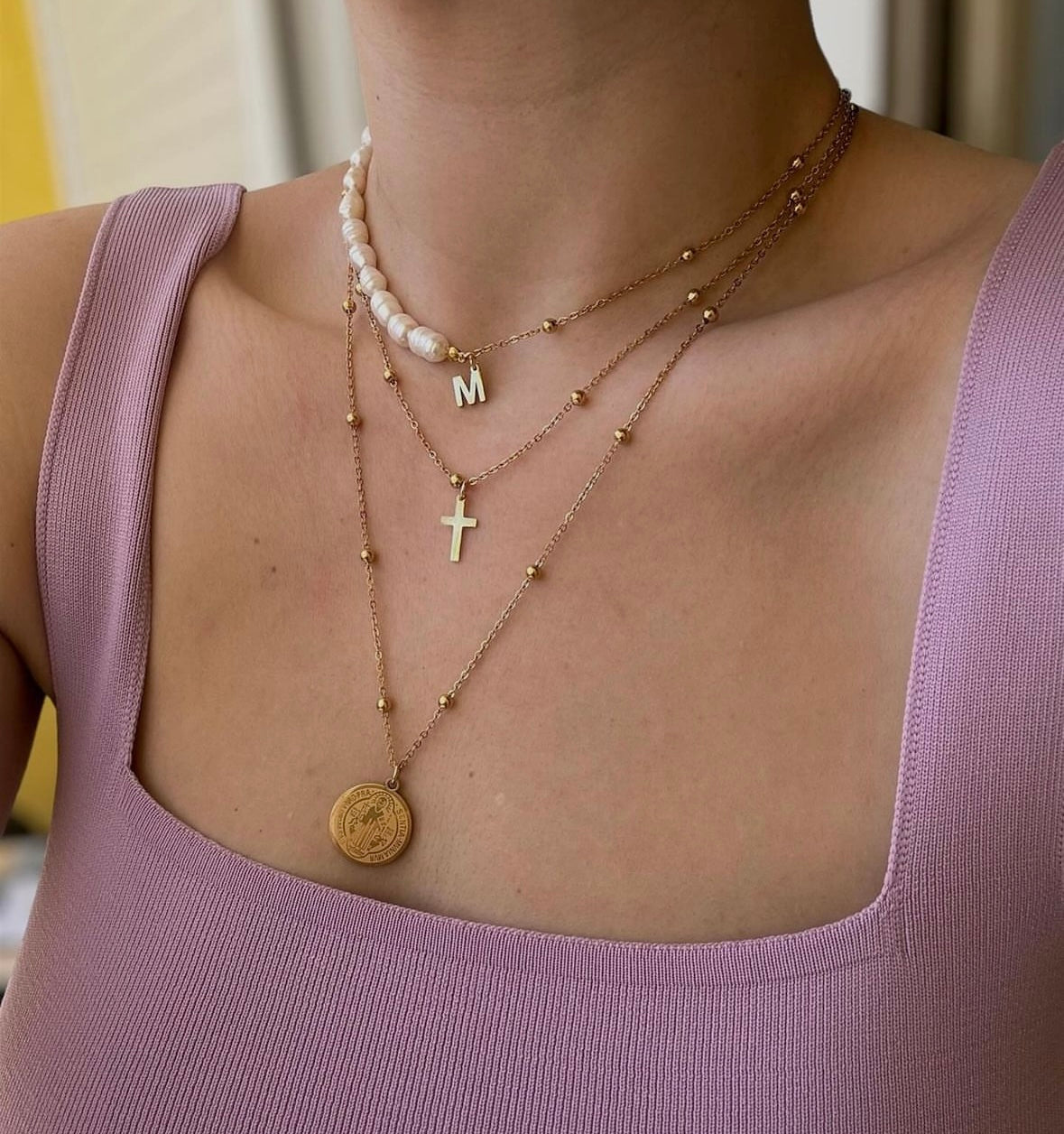 Sastoji se od nehrđajućeg čelika, nepravilnih riječnih bisera i personaliziranih simbola po želji, koji dodaju osobnu notu. Ogrlica može biti nošena kao jedan spojeni komad ili se može odvojiti na dva odvojena lanca, ovisno o tvojoj želji i prigodi. Uz to, gravura može biti dodana na jednu ili obje ogrlice, čineći ovaj nakit još jedinstvenijim i osobnijim.