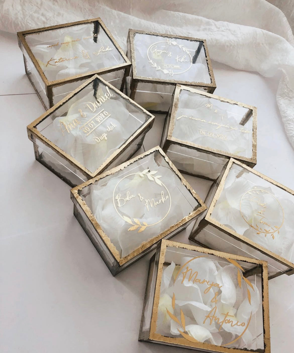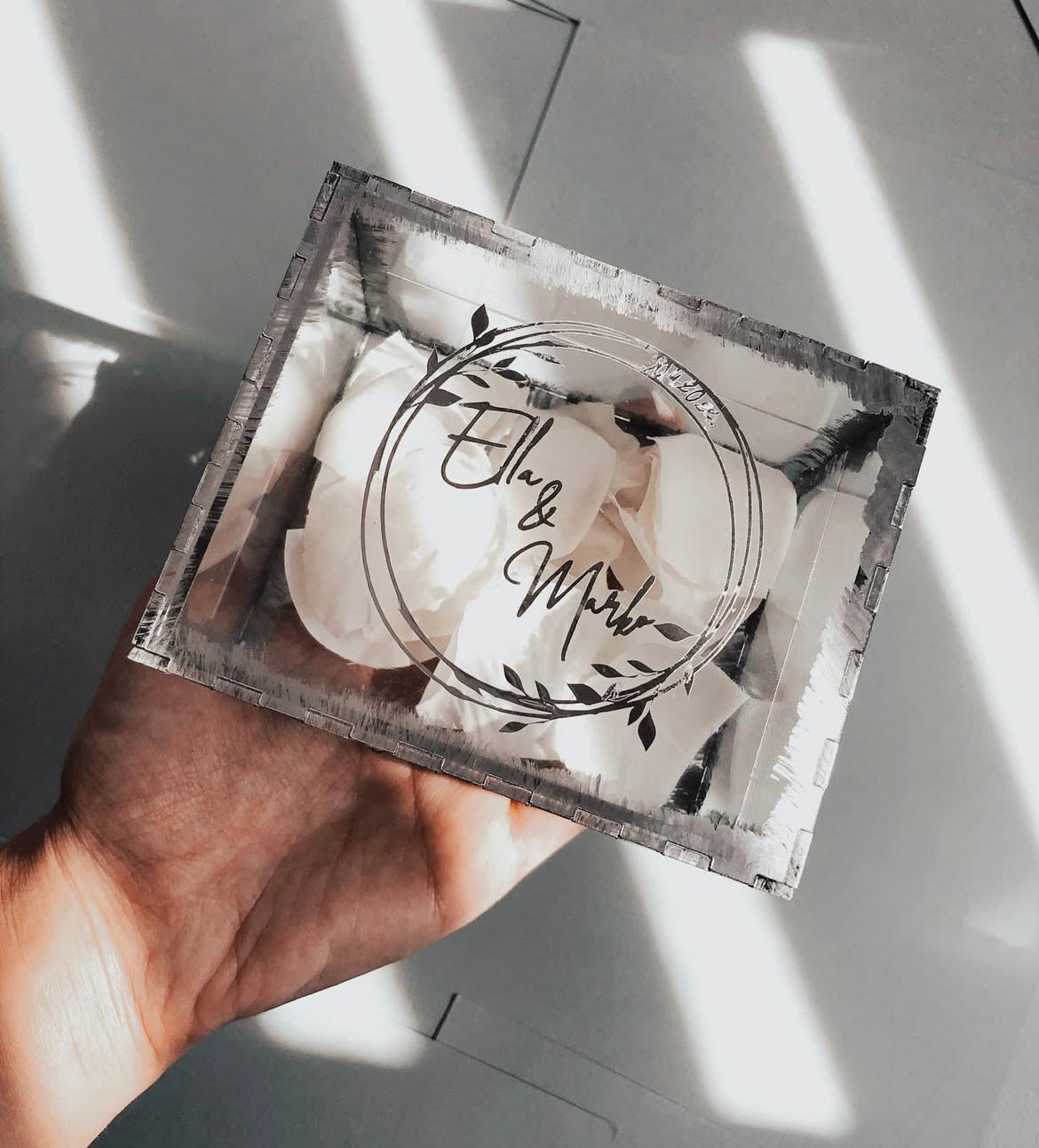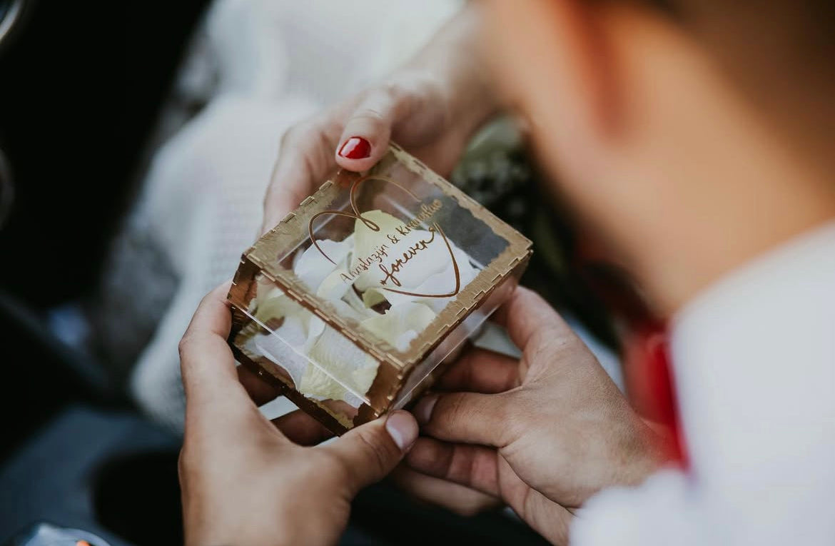 Ispišite svoje inicijale, datum vjenčanja ili posebno značenje koje želite podijeliti s partnerom. Svaka kutija je jedinstvena i prilagođena vašem stilu.