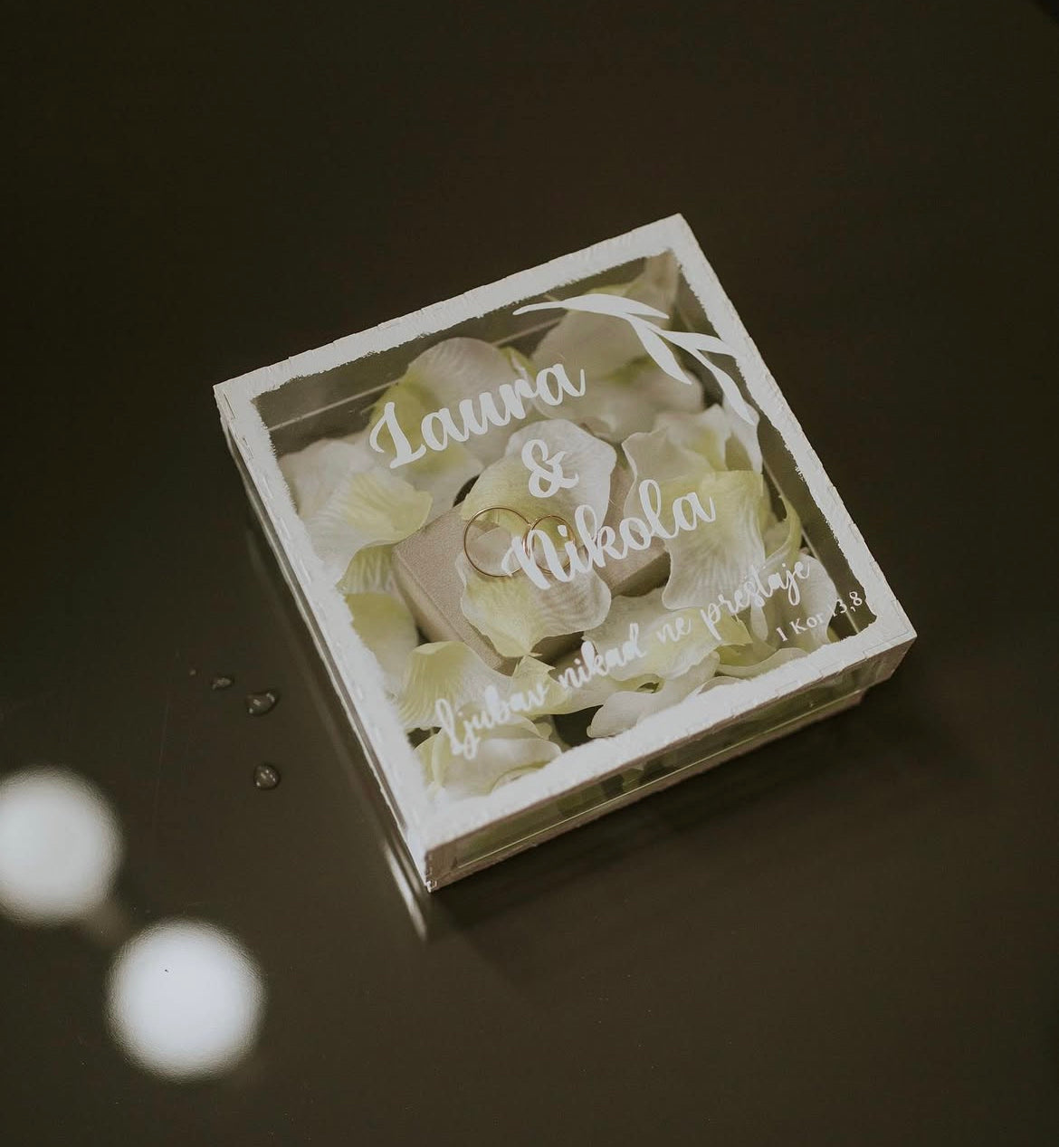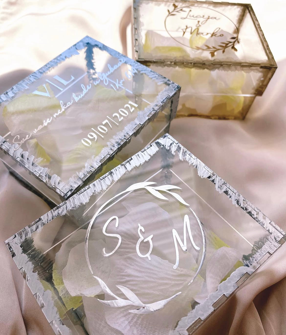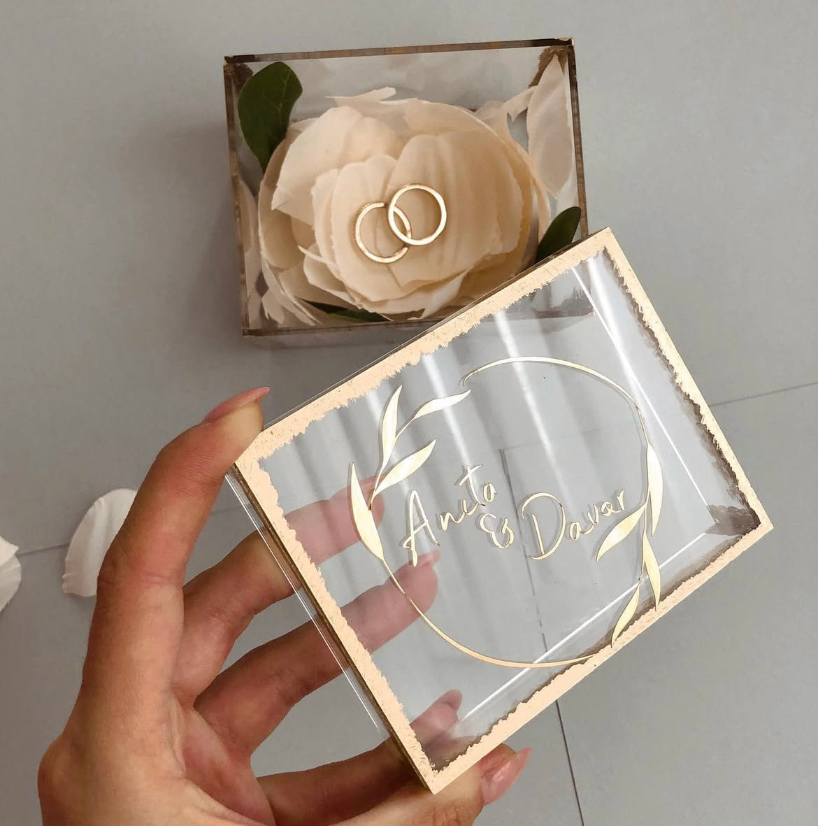Dodajte dašak elegancije i osobnog šarma vašem vjenčanju uz našu personaliziranu kutiju za prstenje od pleksiglasa.