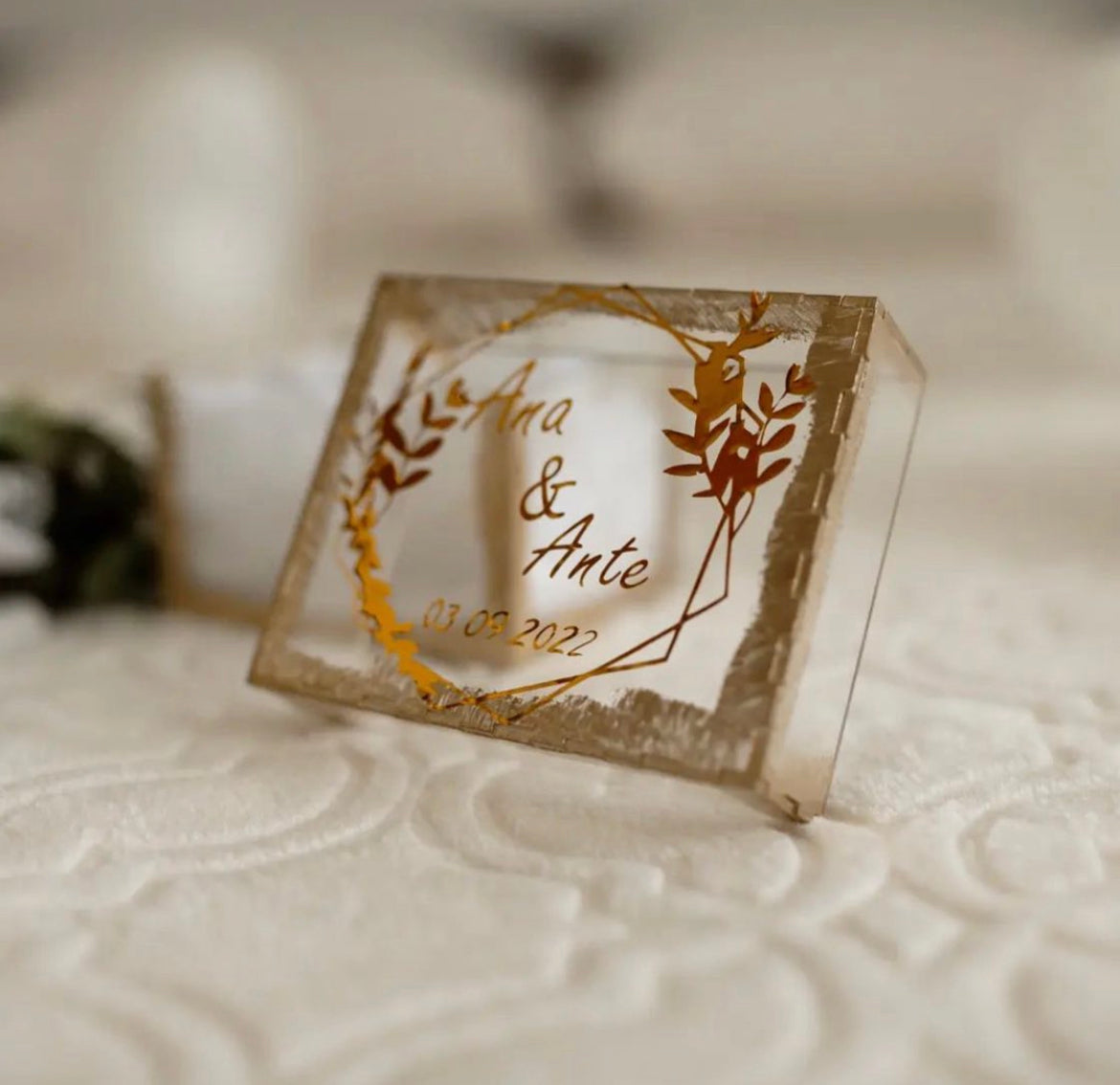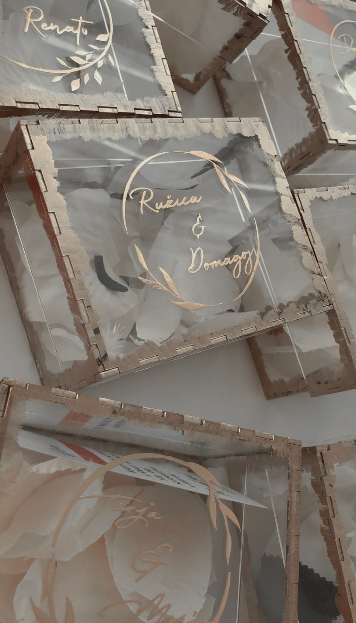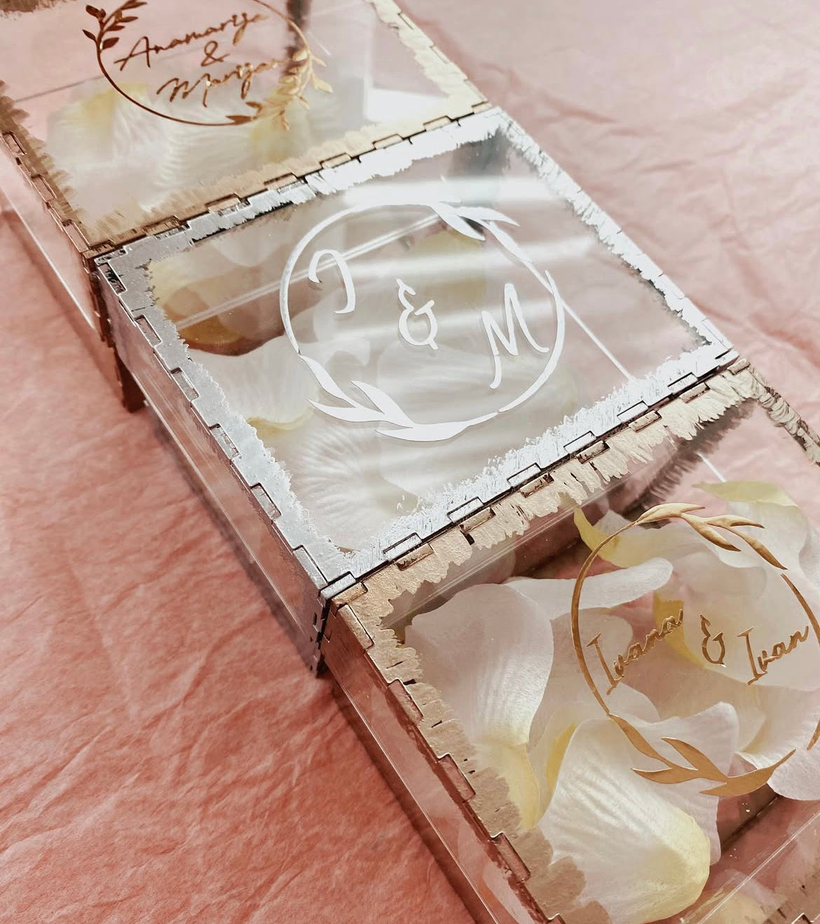 Dodajte dašak elegancije i osobnog šarma vašem vjenčanju uz našu personaliziranu kutiju za prstenje od pleksiglasa.