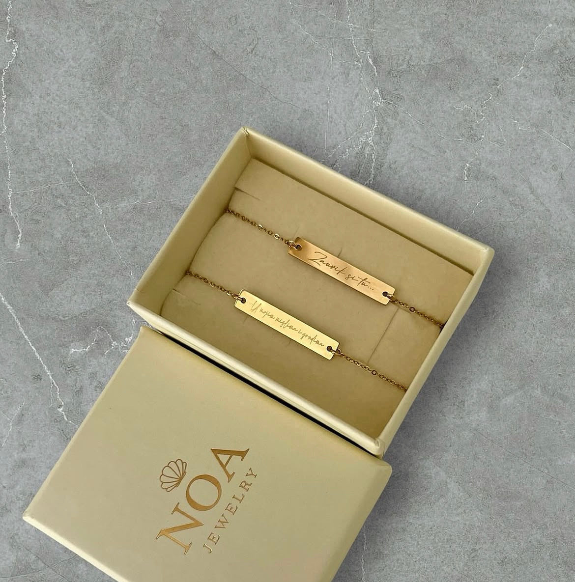 Narukvica s pozlaćenom čelik pločicom i lancem od nehrđajućeg čelika. Vodootporna i ne mIjenja boju.