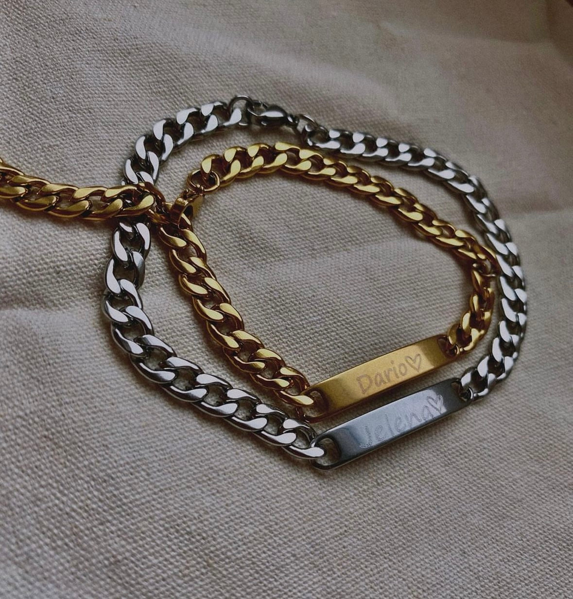 Narukvica od najkvalitetnijeg nehrđajućeg čelika u zlatnoj i srebrnoj boji. Moguća je gravura teksta/slike/citata.