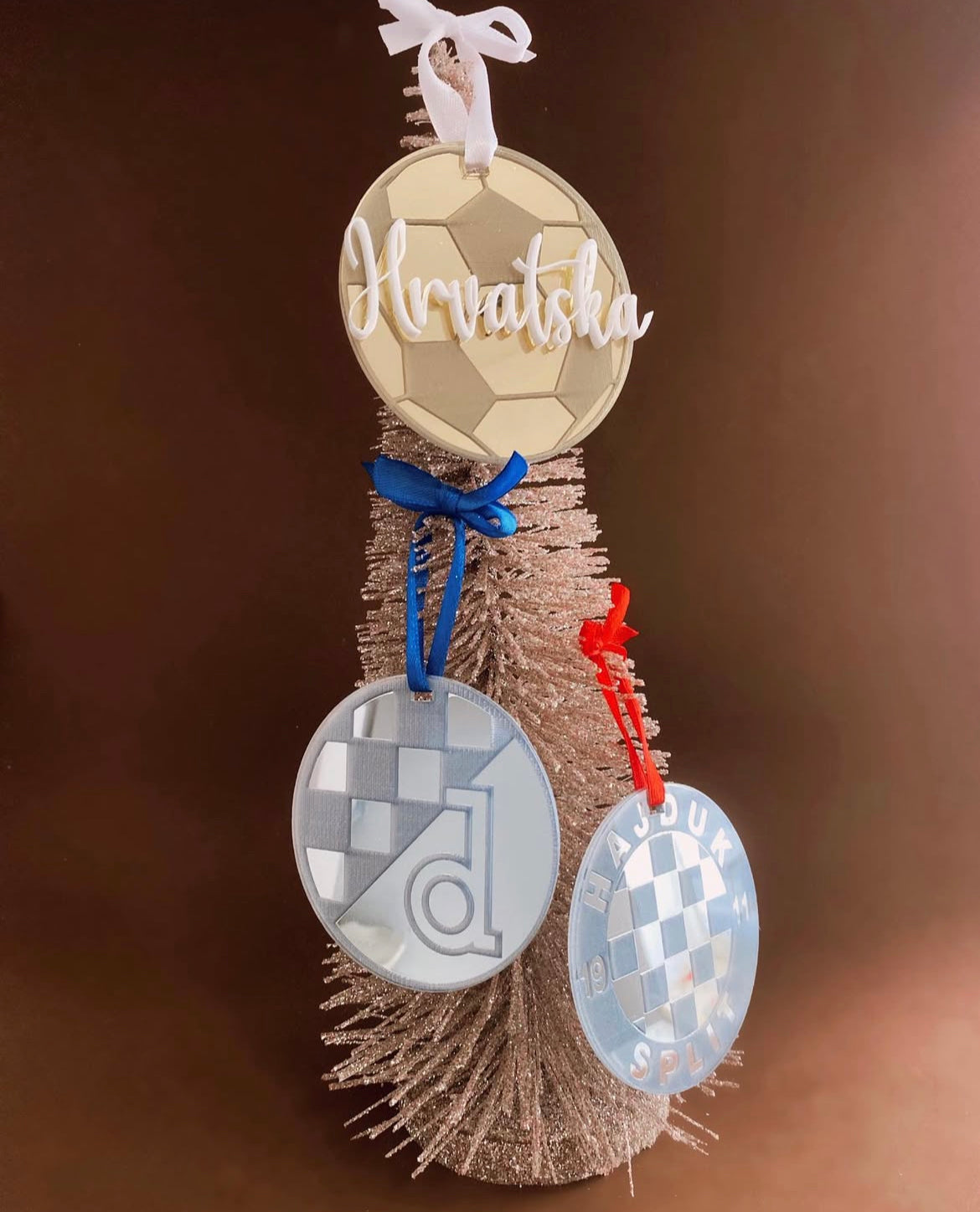 Pleksiglas (ili akrilno staklo) je vrlo lagan i otporan materijal koji se često koristi za izradu različitih dekoracija, uključujući kuglice ili ornamentale. Kuglice od pleksiglasa mogu biti prozirne ili obojene. Ovisno o dizajnu, natpis može biti u različitim fontovima, veličinama i stilovima (npr. s posebnim motivima ili u obliku personaliziranih poruka).