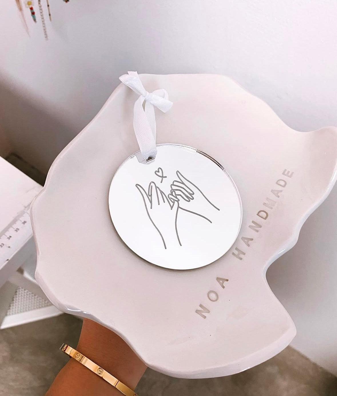 Pleksiglas (ili akrilno staklo) je vrlo lagan i otporan materijal koji se često koristi za izradu različitih dekoracija, uključujući kuglice ili ornamentale. Kuglice od pleksiglasa mogu biti prozirne ili obojene. Ovisno o dizajnu, natpis može biti u različitim fontovima, veličinama i stilovima (npr. s posebnim motivima ili u obliku personaliziranih poruka).