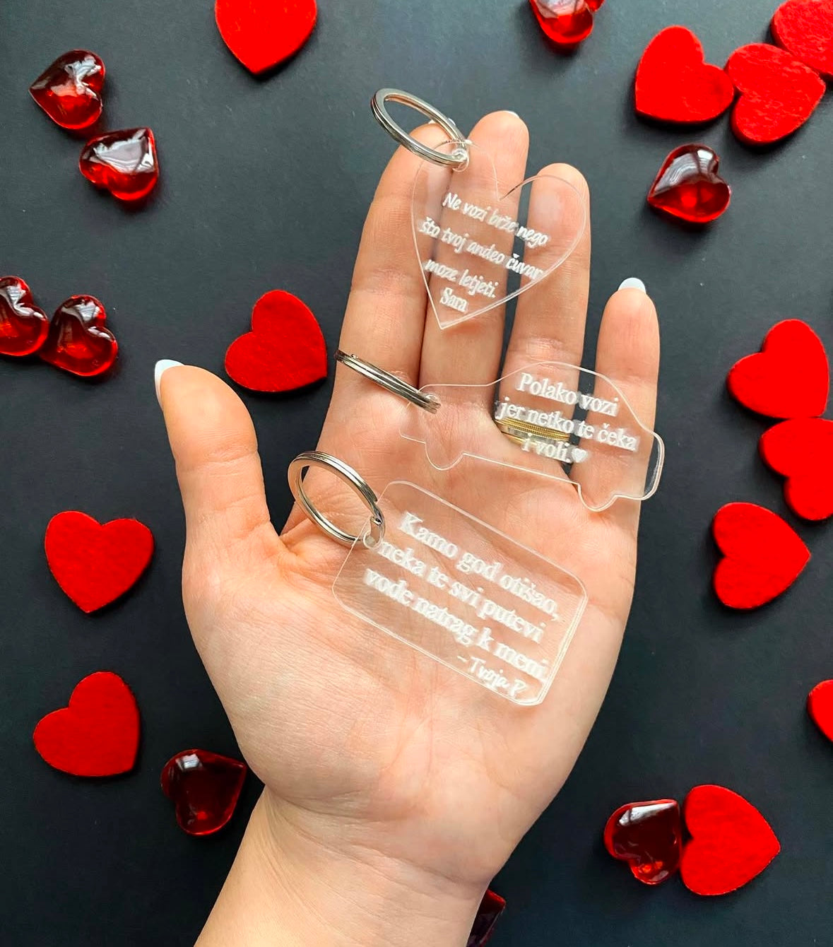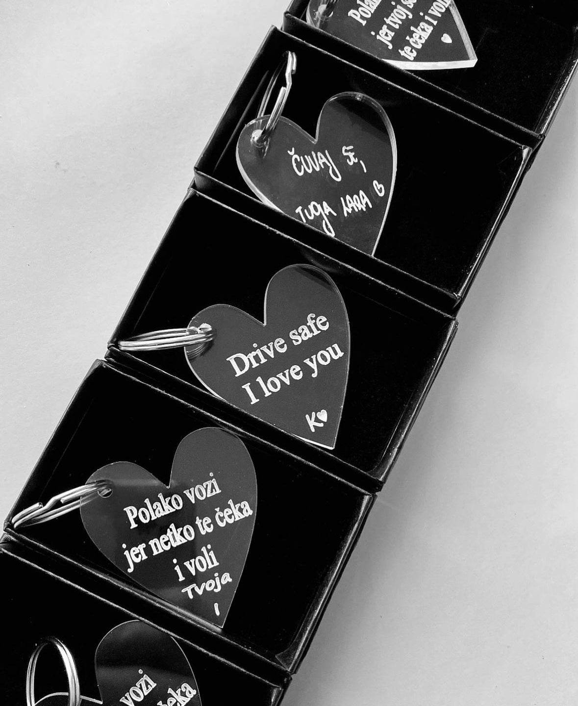 Privjesak od čvrstog nelomljivog pleksiglasa s gravurom po tvojoj želji. Mali znak pažnje za tvoje najdraže koji uvijek mogu nositi sa sobom. Možeš dodati tekst, inicijale ili rukopis. Svoje želje upiši u polju za tekst ispod slike