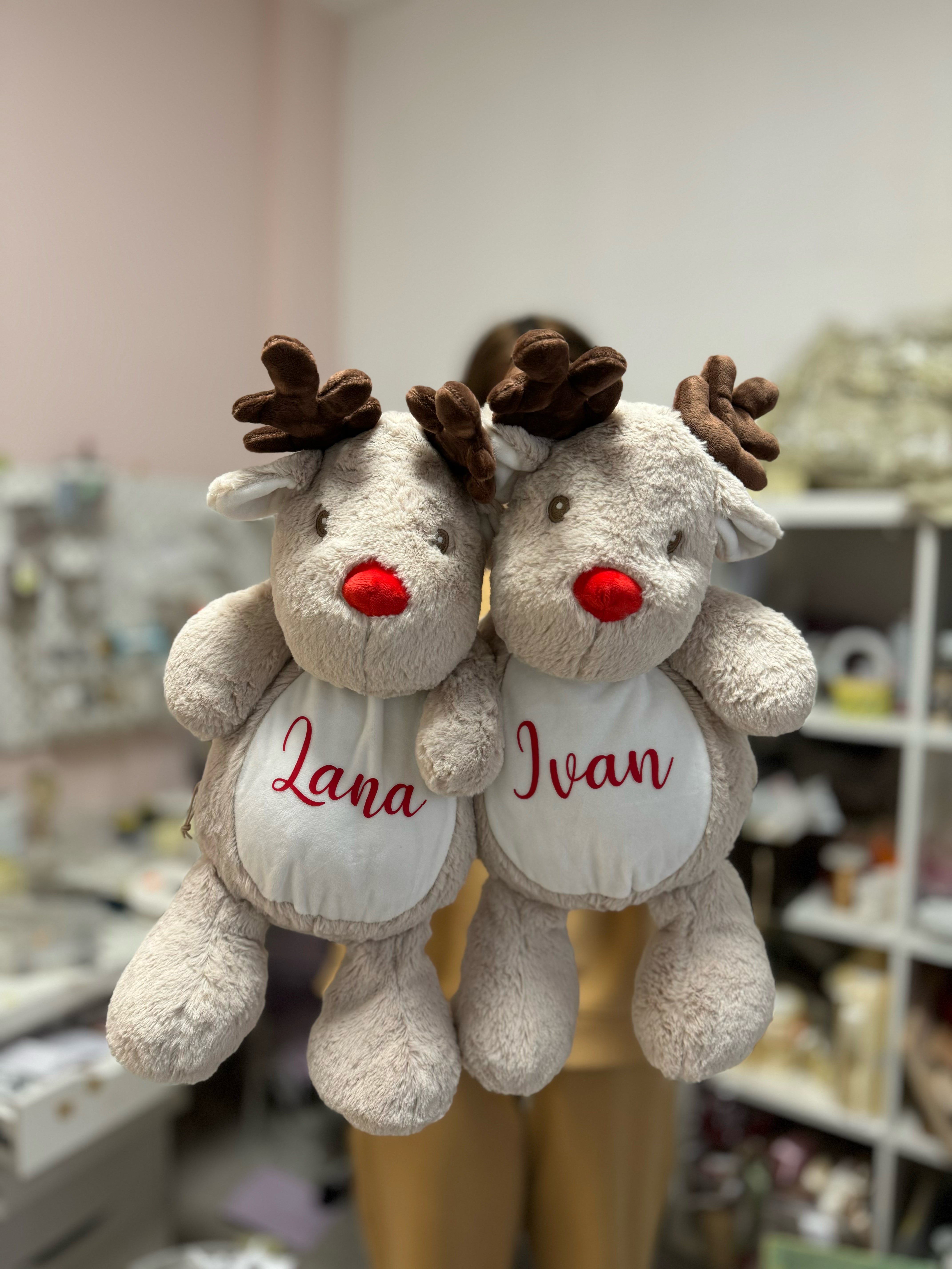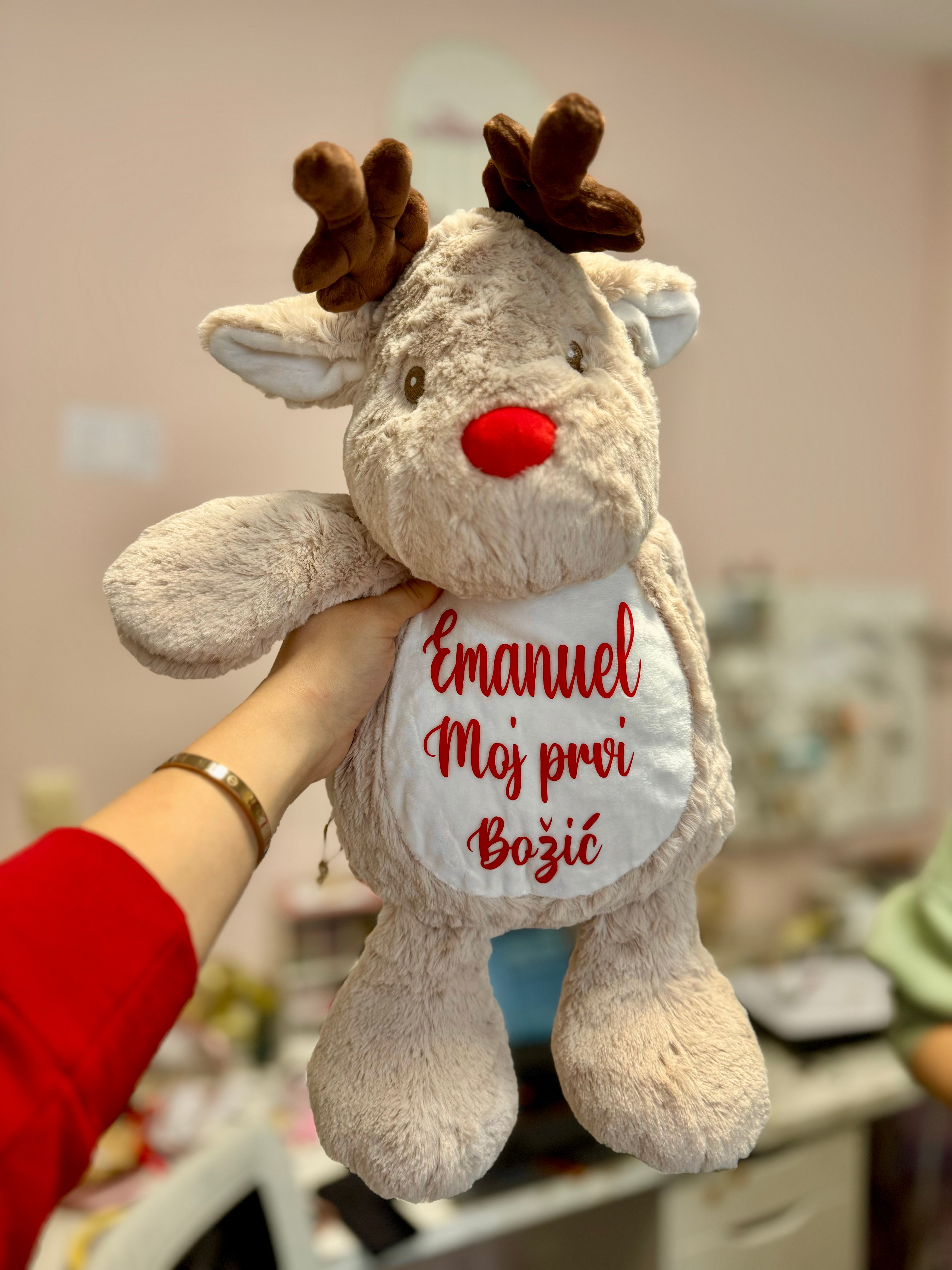 Božićni plišani sob s personaliziranim tekstom po želji je sjajan poklon za blagdane, koji može biti i ukras, i sentimentalni dar. Plišani sobovi, simboli zime i Božića, često dolaze u veselim i nježnim dizajnima, a personalizirani tekst dodaje emocionalnu vrijednost ovom slatkom poklonu.