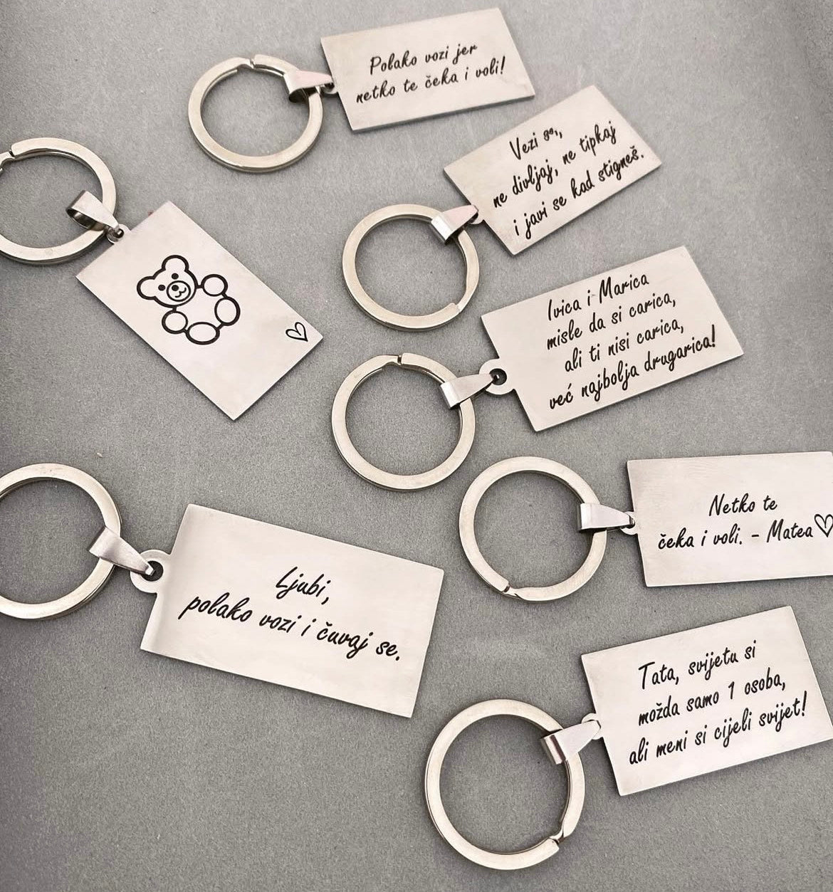 Privjesak za ključeve s gravurom na nehrđajućem čeliku savršen je spoj stila i funkcionalnosti. Oblik kvadrata jedan je od najprodavanijih oblika. Nehrđajući čelik osigurava dugovječnost i otpornost na oštećenja. Gravura na čeliku može biti personalizirana prema tvojoj želji — ime, datum, citat, simbol, slika, rukopis — čineći privjesak jedinstvenim i osobnim.
