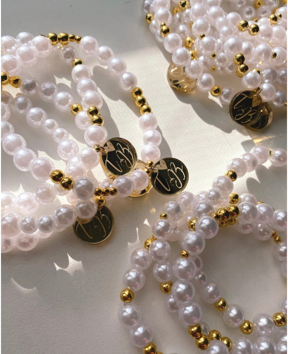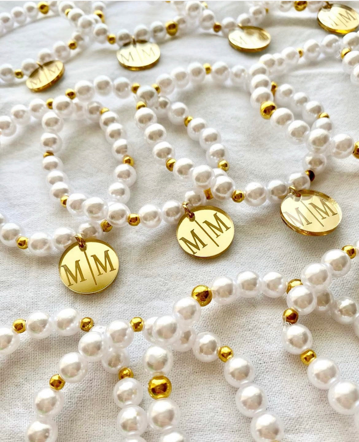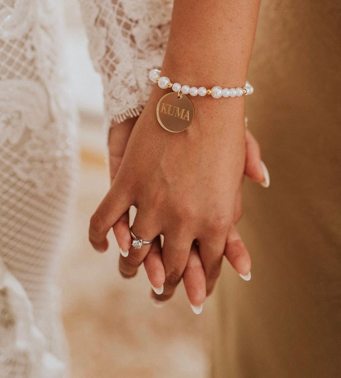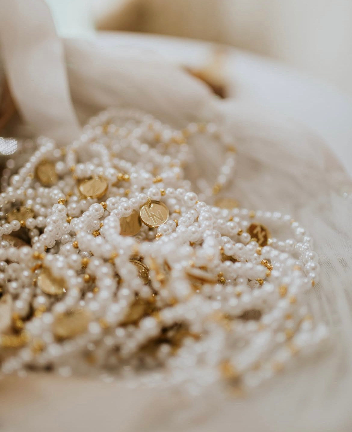 Ručno nizani biserni reveri sa zlatnim detaljima i privjeskom personaliziranim po izboru. Ovi reveri su izrađeni od visokokvalitetnog materijala, sa zlatnim i bisernim nijansama bisera koje im daju luksuzan izgled.